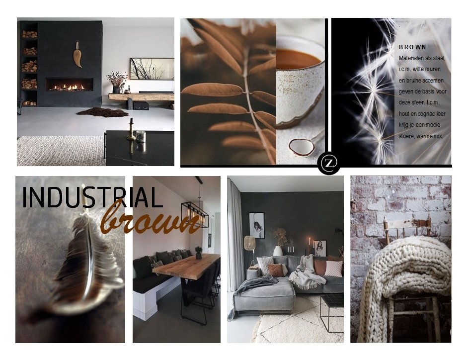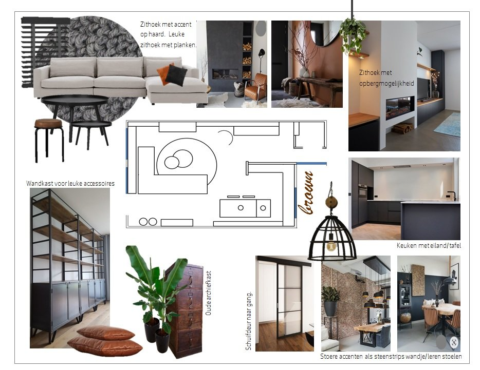 Een warme gezellige woonkamer met industriële accenten, bruin, zwart kleurenpalet,